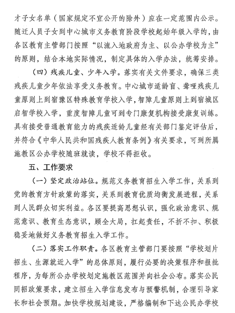 ●中心城市适龄盲、聋哑残疾儿童原则上到宿豫区特殊教育学校入学,智障儿童原则上到宿城区启智学校入学,重度智障儿童可到专门康复机构接受康复训练。具有接受普通教育能力的残疾适龄儿童经有关部门鉴定评估后,并符合《中华人民共和国残疾人教育条例》有关要求,可到所属施教区公办学校随班就读,学校不得拒收。