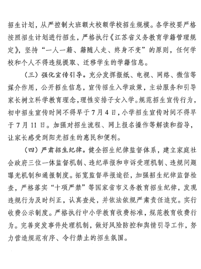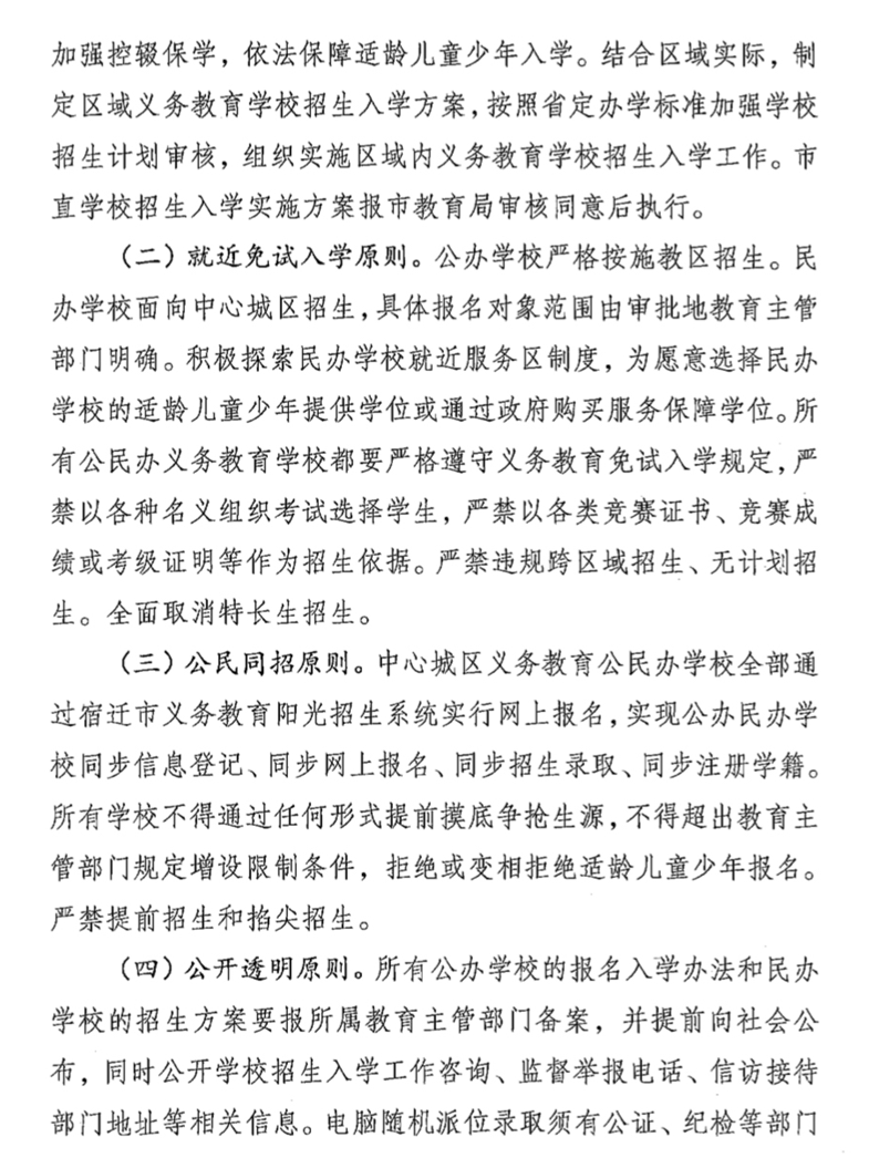中心城区义务教育公民办学校全部通过宿迁市义务教育阳光招生系统实行网上报名,实现公办民办学校同步信息登记、同步网上报名、同步招生录取、同步注册学籍。所有学校不得通过任何形式提前摸底争抢生源,不得超出教育主管部门规定增设限制条件,拒绝或变相拒绝适龄儿童、少年报名。严禁提前招生和掐尖招生。