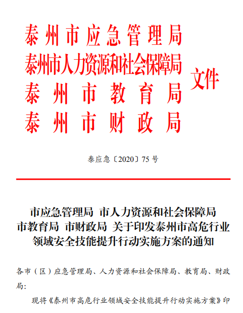 近日,市应急管理局、市人力资源和社会保障局、市教育局、市财政局等多部门联合出台《泰州市高危行业领域安全技能提升行动实施方案》(以下简称《方案》),旨在全面提升化工、非煤矿山、金属冶炼、烟花爆竹等高危行业企业(以下简称“高危企业”)从业人员和各类特种作业人员安全技能水平。