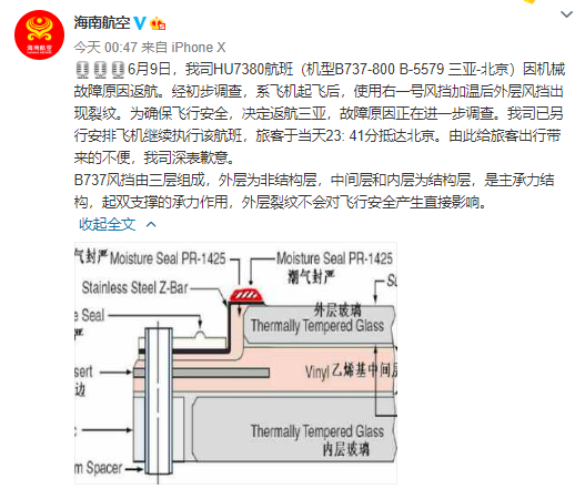 有民航飞行员表示,海南航空HU7380航班出现的副驾风挡玻璃裂纹,从现有的资料来看还没有对航空器的正常运行造成实质性影响,“机组在出现裂纹后第一时间选择返航、备降,正是为了航空器安全的最优选择”。