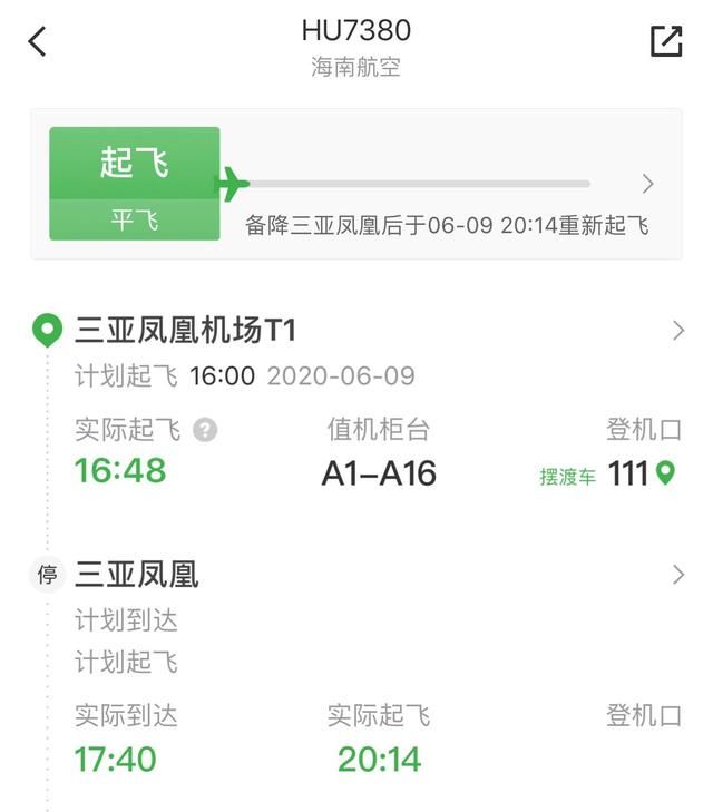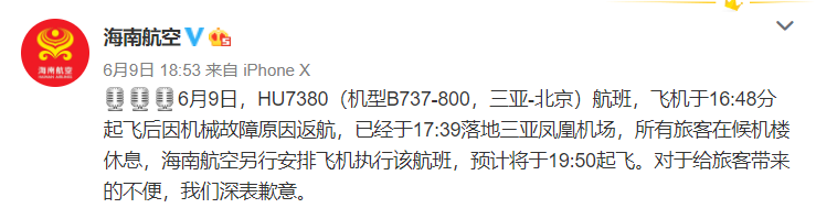据航班计划,海南航空HU7380航班原定于6月9日下午16点起飞飞往北京,航班在延误48分钟后从三亚凤凰机场起飞。海南航空方面发布通报称,HU7380后因机械故障原因返航,并于17:39落地三亚凤凰机场。