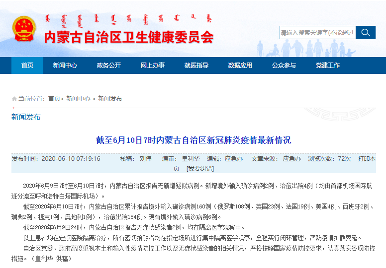 荔枝新闻讯 据内蒙古卫健委网站消息,2020年6月9日7时至6月10日7时,内蒙古自治区报告无新增疑似病例。新增境外输入确诊病例2例、治愈出院4例(均由首都机场国际航班分流至呼和浩特白塔国际机场)。