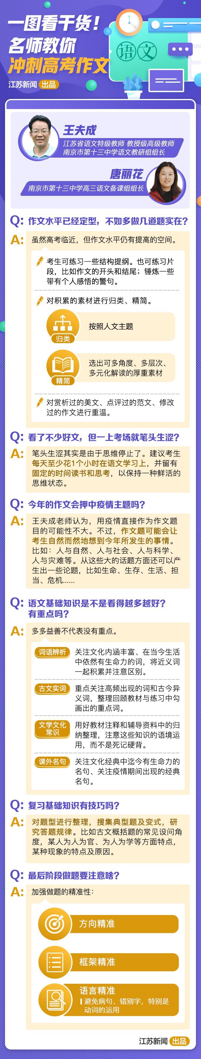 【@江苏高考生,一图看干货!名师教你冲刺高考作文】高考倒计时一个月冲刺阶段,改变命运的可能就在当下每一天。作文水平已经定型,还有提高的空间吗?今年的作文会押中疫情主题吗?看了不少好文,但一上考场就无从下笔?语文基础知识复习有重点吗?戳图看名师教你踢好语文复习“临门一脚”↓转起加油!