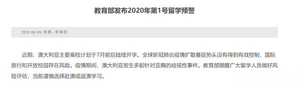 6月9日教育部发布今年"1号留学预警",提醒广大留学人员做好风险评估,当前谨慎选择赴澳或返澳学习。