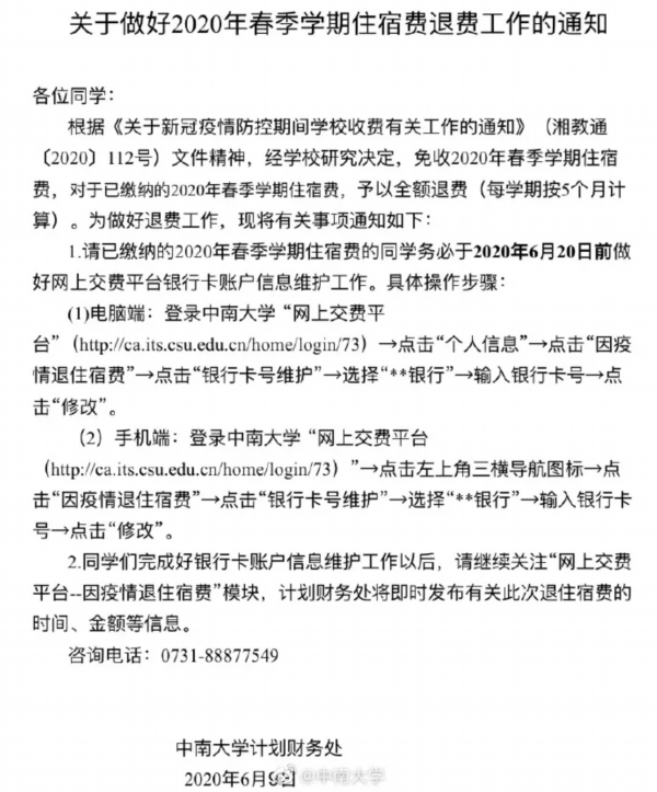 今日,中南大学宣布免收春季学期住宿费,对已缴纳的住宿费予以全额退费。