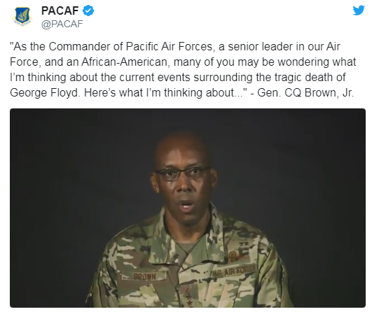 获得提名后,布朗5日在美国太平洋空军(PACAF)官方推特账号上发表视频讲话,讲述了他对弗洛伊德事件的看法,也坦率地提到了他本人曾遭受的种族歧视。