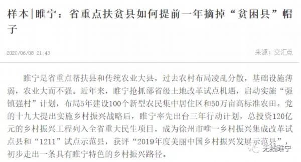 近年来,睢宁抢抓部省级土地改革试点机遇,启动实施“强镇强村”计划,布局5年建设100个新型农民集中居住区和50万亩高标准农田,总投资120亿元的乡村振兴工程列入全省重大民生项目,初步走出一条具有睢宁特色的乡村振兴路径,并提前一年高质量摘掉“贫困县”帽子。