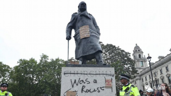 哪怕中国人很熟悉的丘吉尔,这个2002年被BBC选为史上最伟大的英国人,他在伦敦的一尊雕像也被涂鸦,抗议者划去他的名字,写下:这是一个种族主义者。