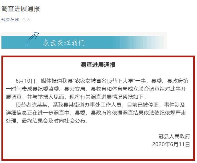 顶替者陈某某,系我县某街道办事处工作人员,目前已被停职,事件涉及详细信息正在进一步调查中。县委、县政府将依据调查结果依法依纪依规严肃处理,最终结果会及时向社会公布。