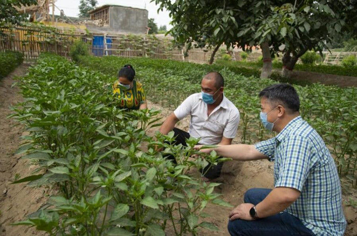 工作队队长木塔力甫·艾白尔(右一)到农户庭院查看辣椒生长状况(买买提艾力摄)