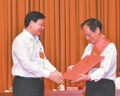 奖励大会上,娄勤俭为获得2019年度省基础研究重大贡献奖的南京航空航天大学宣益民院士、南京大学祝世宁院士颁发奖励证书,同他们热情握手表示祝贺,并请他们到主席台就座。