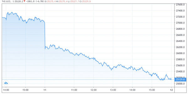 当天,道琼斯工业平均指数报收25128.17点,大跌1861.82点,跌幅6.9%。与道指类似,标普500指数及纳斯达克指数同样经历暴跌,分别下跌了5.89%和5.27%。