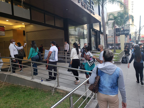 圣保罗市购物中心恢复营业的第一天 人群在入口排队检测体温(图片来自巴西媒体环球网)