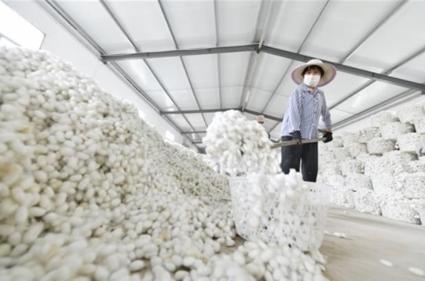 蚕茧收购点的工作人员正忙着分级堆放蚕茧。