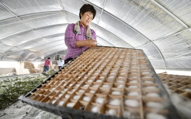 桃园镇农技中心高级农艺师许营介绍:“以前都是用塑料折簇养蚕,今年桃园镇大力推广方格簇,方格簇比塑料折簇的好处是一次投资多年受益,使用方便且便于保管,现在这一技术已在桃园镇推广开来,蚕茧的质量和总量获得双提升。”今年桃园镇共计饲养春蚕蚕种15000多张,收获蚕茧超120万斤,预计产值达2100万元,有效带动了群众致富。