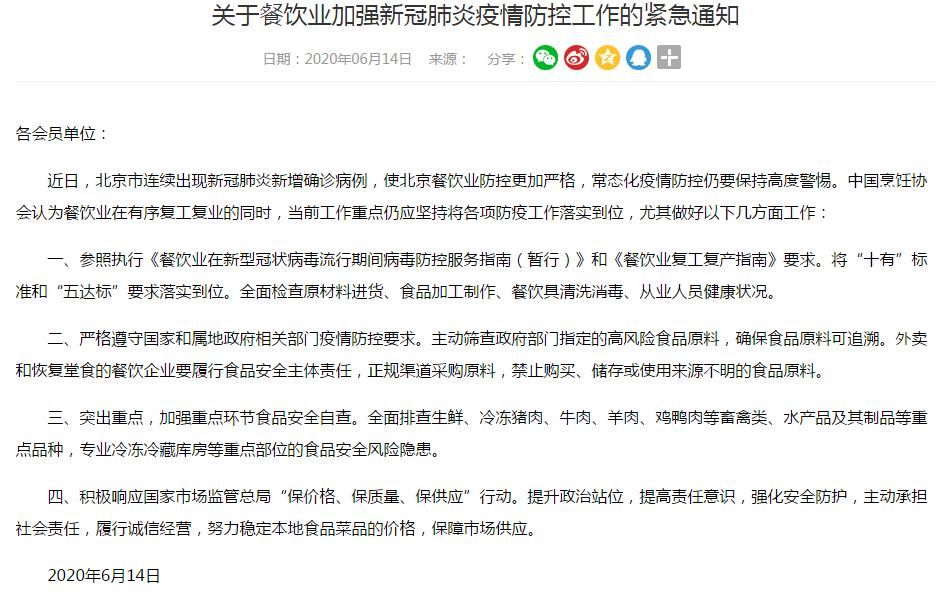 荔枝新闻讯 6月14日晚,中国烹饪协会发布餐饮业加强新冠肺炎疫情防控的紧急通知,提出餐饮业加强重点环节食品安全自查,全面排查生鲜、冷冻猪肉、牛肉、羊肉、鸡鸭肉等畜禽类、水产品及其制品等重点品种,专业冷冻冷藏库房等重点部位的食品安全风险隐患。同时要保证餐饮业供应、质量及价格稳定。