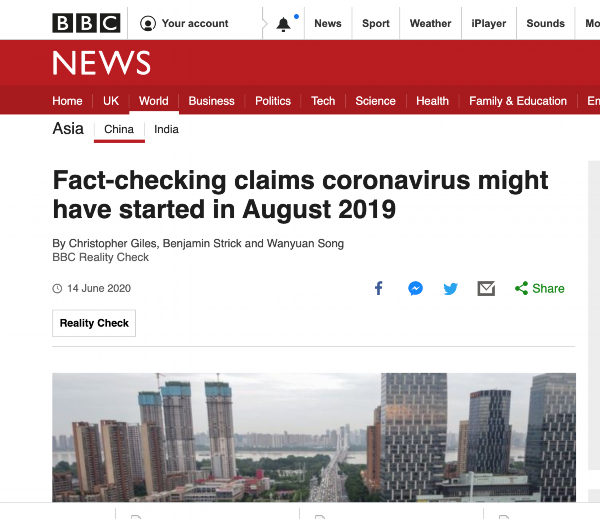 6月14日,BBC网站发表对哈佛大学论文进行事实核查的文章,认为论文的结论——去年8月就有新冠病毒在武汉传播——是缺乏足够证据的。