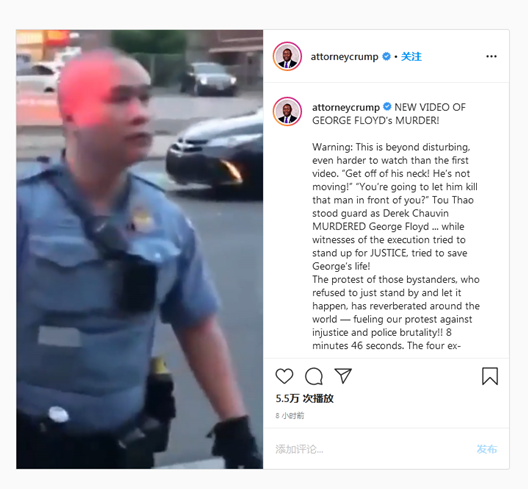 在Instagram上发布这段视频的克伦普配文称,“这不仅是令人不安的,而且比第一段视频更加难以直视。”“当德雷克·肖万谋杀乔治·弗洛伊德时,杜滔站岗(守卫)……而这场‘行刑’的目击者试图伸张正义,试图挽救弗洛伊德的命。”