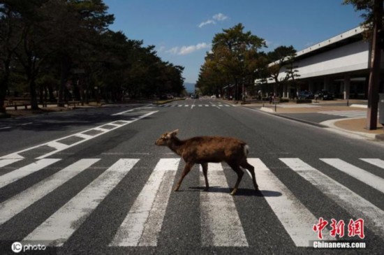 资料图:当地时间3月19日,日本奈良的小鹿正在过马路。奈良的1000多头鹿是当地一道风景,投喂小鹿给游客带来很多乐趣。图片来源:ICphoto