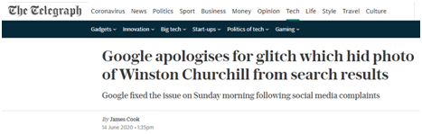 【环球网报道】“我怎么搜不到丘吉尔的照片了?”13日开始,许多网友在推特上提出这个困惑。据英国《电讯报》14日报道,近日,在谷歌搜索关键词“英国首相”时,前英国首相温斯顿·丘吉尔的照片却从图库中消失了,取而代之的是一个灰色的通用头像。对此,谷歌14日致歉称,这只是暂时的系统故障,并非有意为之。此前,丘吉尔纪念雕像曾两度在示威抗议中被肆意涂鸦,为防止雕像再遭破坏,伦敦市政府用挡板围住丘吉尔雕像予以保护。