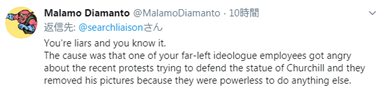 “你们就是骗子,你们知道的。原因就是你们的一名极左翼员工对最近大家试图在抗议活动中保护丘吉尔雕像而感到愤怒,所以他们删除了他的照片,因为他们无能为力。”