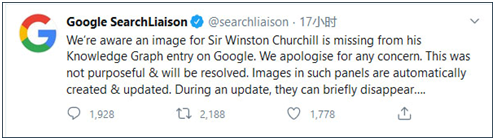 对于网友的愤怒指责,谷歌14日表示已经注意到这一现象,并在官方推特上做出相关回应。谷歌解释说,这种情况并非有意为之,而是由于“系统出现错误从而阻止了新图像的更新,所以丘吉尔的照片自4月下旬至本周末一直未能更新。” 随后,谷歌对于“因看不到丘吉尔图片而引发了担忧”表达歉意,并称将寻求解决这个问题,以避免未来再次出现这个问题。
