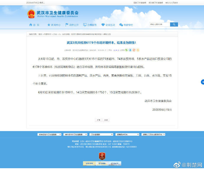 从6月13日起,市、区疾控中心已连续3天对15个区的75家超市、74家农贸市场、5家水产品进出口贸易公司的6178个环境样本(包括环境和物品)进行采样检测,所有样本新冠病毒核酸检测结果均为阴性。