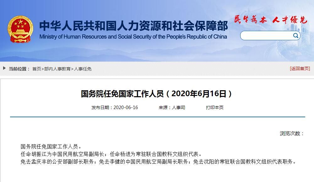 免去孟庆丰的公安部副部长职务;免去李健的中国民用航空局副局长职务;免去沈阳的常驻联合国教科文组织代表职务。