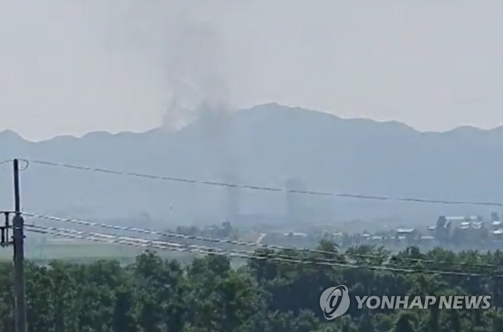 △朝韩非军事区内韩方村庄观测到的开城方向黑烟(图片来源:韩联社)