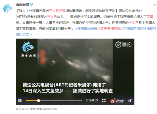 据海客新闻,德法公共电视台(ARTE)记者14日深入三文鱼故乡——挪威进行了实地调查。记者弗洛丁私带摄像机潜入了养殖场,目睹恐怖一幕:大量鱼挤在肮脏、充满它们排泄物的海水里。许多得病的三文鱼身上布满大如手掌的溃疡,有的已变成S型畸形鱼”。