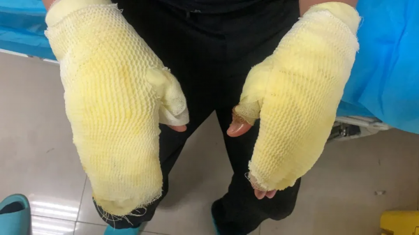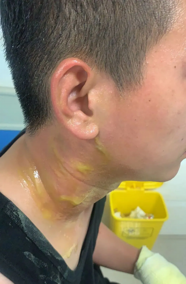 “整个过程也就几分钟。关阀门的时候被烧着了也没感觉,到家了才开始疼。媳妇给我抹了药膏,感觉好些了。”当时,张雨双手和脖子除了一片通红,并没有破皮等其他症状,两人都以为情况并不严重。