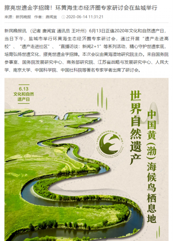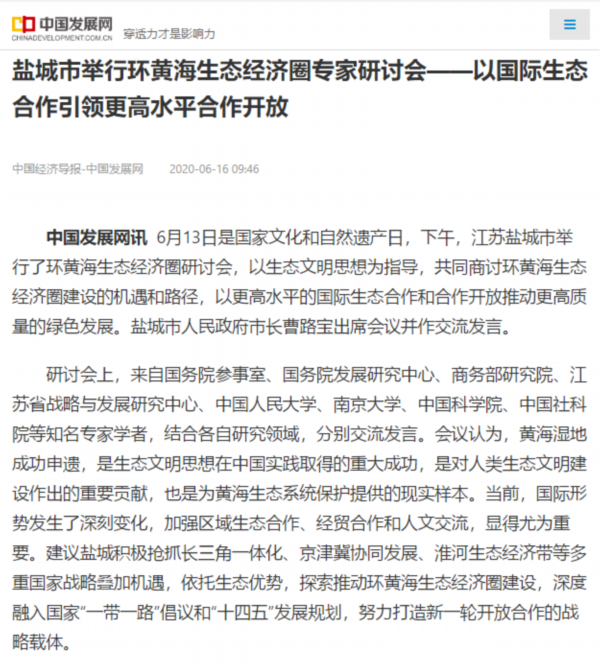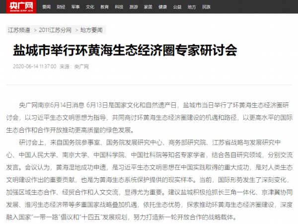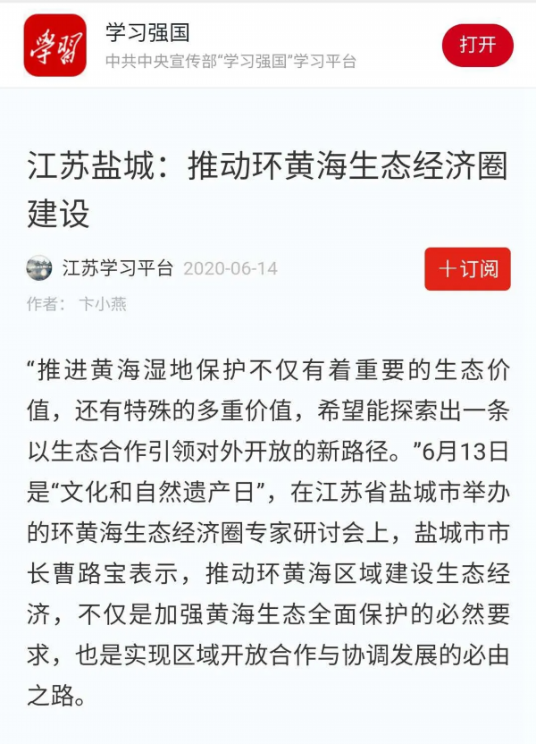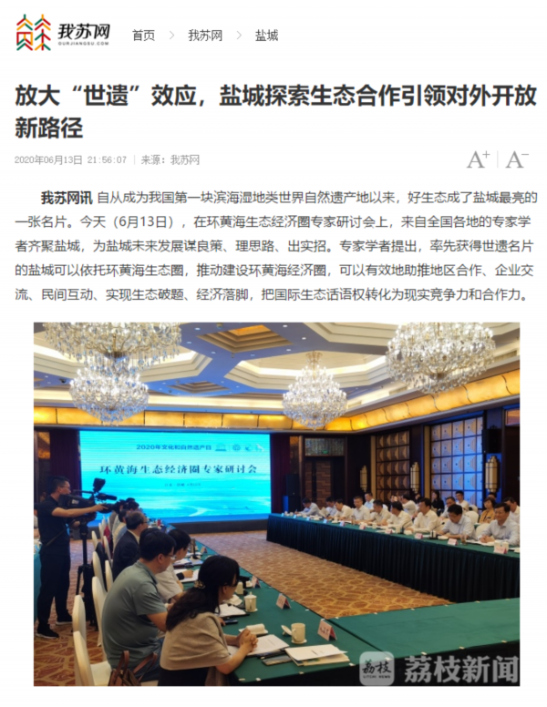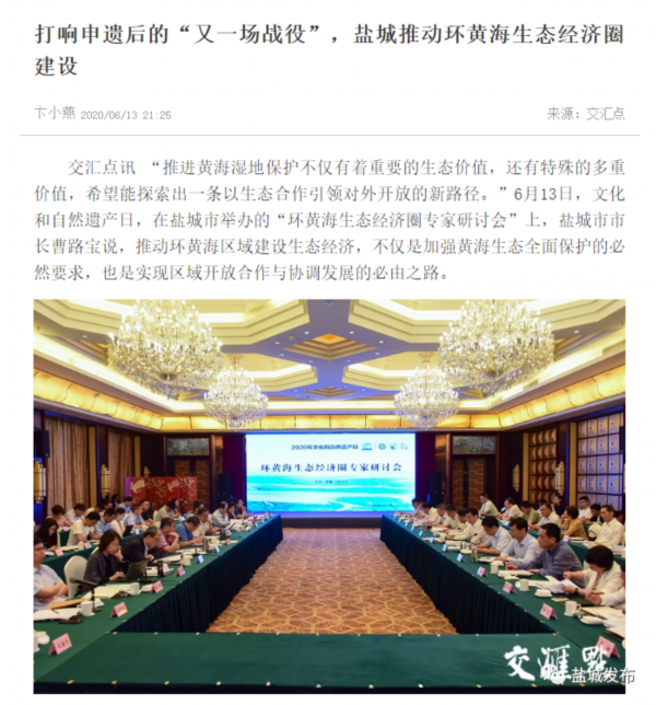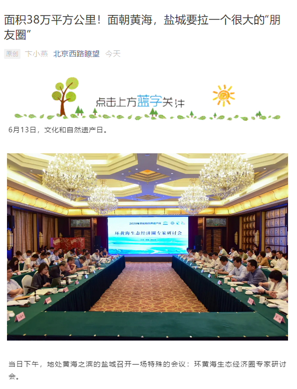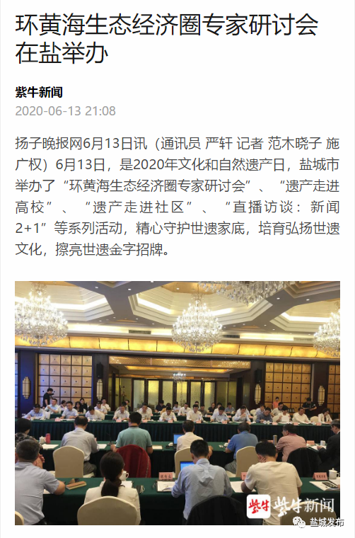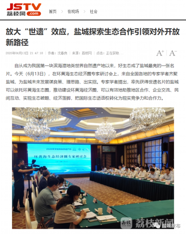 6月13日是国家文化和自然遗产日。当天下午,盐城市举行环黄海生态经济圈研讨会,以习近平生态文明思想为指导,共同商讨环黄海生态经济圈建设的机遇和路径,以更高水平的国际生态合作和合作开放推动更高质量的绿色发展。