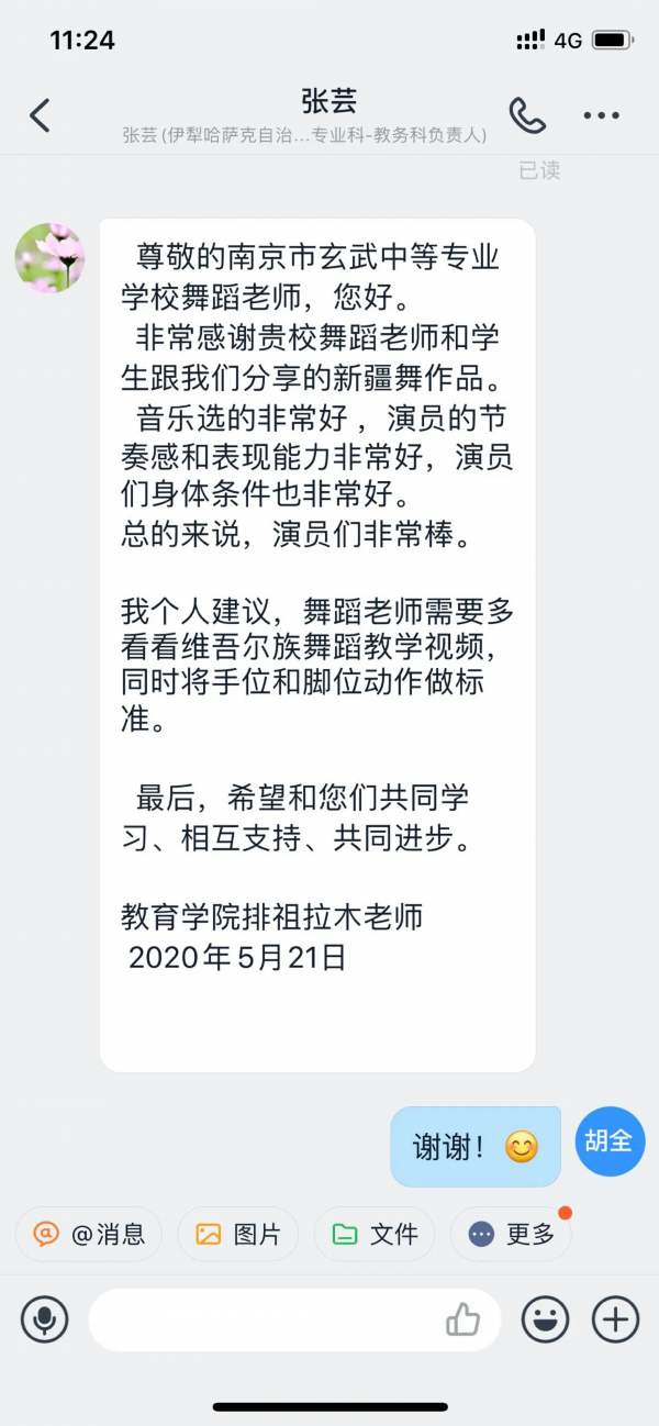 在储开峰的支持下,胡全联系上了教育学院教务科科长张芸,说明情况后。张芸当天便录制了两个视频,一个是伊犁丝路职业学院(筹备)教师舞蹈视频,一个是伊犁丝路职业学院(筹备)舞蹈老师排祖拉木对玄武中专学生舞蹈的点评视频。录制完后,张芸便把视频转发给了胡全,同时邀请胡全第二天与学院的两位舞蹈专业老师进行当面交流。胡全把视频发回南京后已是当日晚上11点,南京市玄武中等专业学校的老师们看到信息非常高兴,表示点评一针见血,将在今后的教学中对学生提出有针对性的指导和修正。