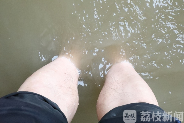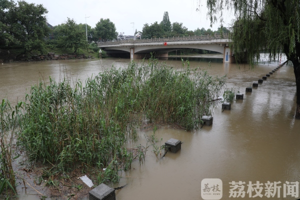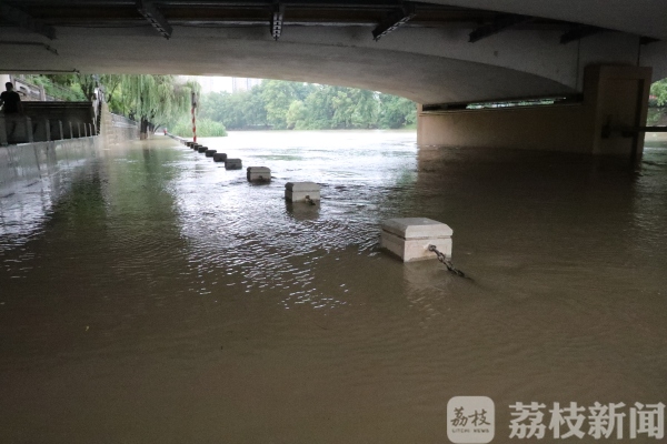 站在南京外秦淮河雨花桥上看到,河水很急,一路汹涌而下。左侧人行观光道不见踪影,只露出一排半截水泥墩。