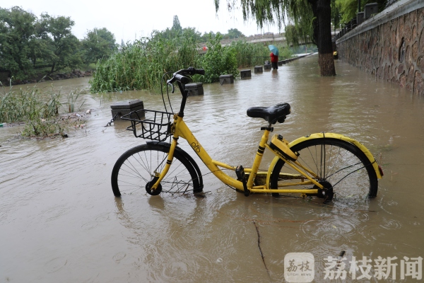 6月16日,河水暴涨,南京雨花门外秦淮河栈道被淹入水中。