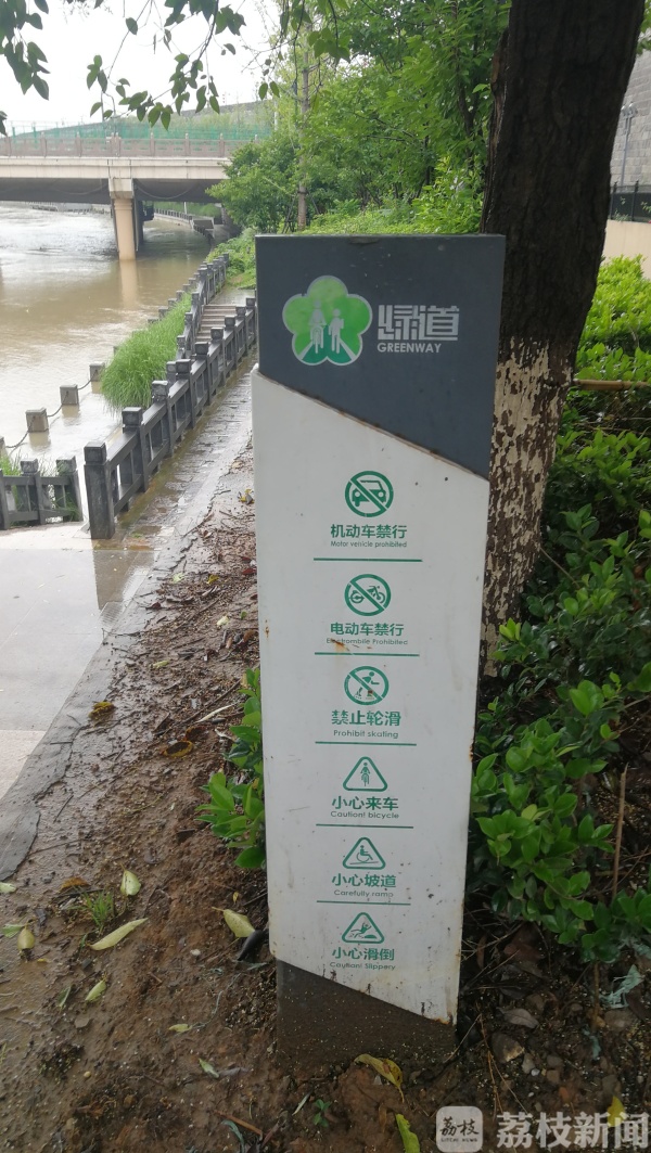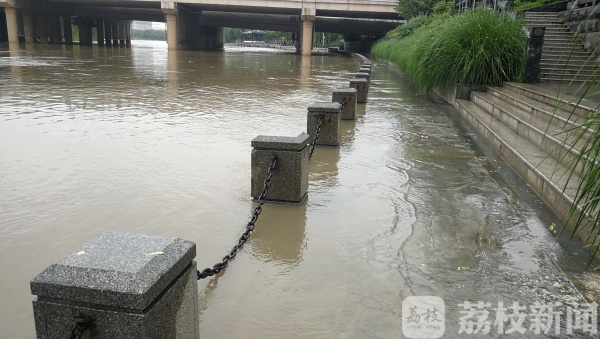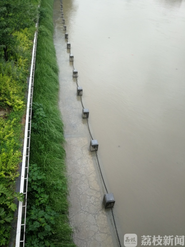 16日上午在南京外秦淮河饮马桥上看到,外秦淮河左侧人行观光道已经被湍急的河水淹没,“早上水还在绿道下方,到10点左右,水已漫上来了。”附近居民说。