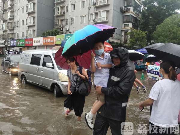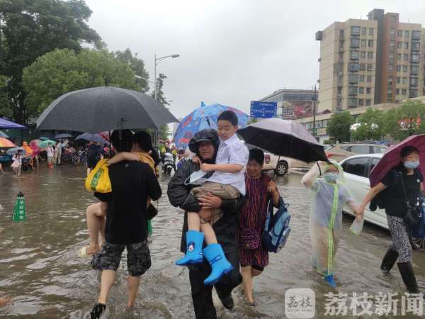 当日早上8点左右,沿江大队执法辅助人员朱雪宝正在百润路附近执勤,他远远看见琅琊路小学天润城分校对面马路上,由于路面积水严重导致许多家长和小孩被围困住。顾不上自己全身湿透,朱雪宝连忙跑了过去,毫不犹豫地当起了“摆渡人”,一趟又一趟蹚着积水将被围困的学生安全地抱到校园门口,家长们纷纷道谢。