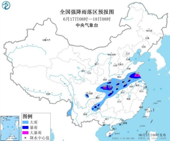 中新网6月17日电 据中央气象台网站消息,中央气象台6月17日6时继续发布暴雨黄色预警:预计,6月17日8时至18日8时,黄淮南部、江淮北部、江汉大部、四川东北部和中部、重庆北部和东南部、陕西东南部、贵州中西部和东北部、湖南西北部、云南西部等地的部分地区有大到暴雨,其中,江苏北部、湖北西部、重庆北部等地局地有大暴雨(100~150毫米)。上述部分地区伴有短时强降水(最大小时降雨量40~60毫米,局地可超过80毫米),局地有雷暴大风等强对流天气。