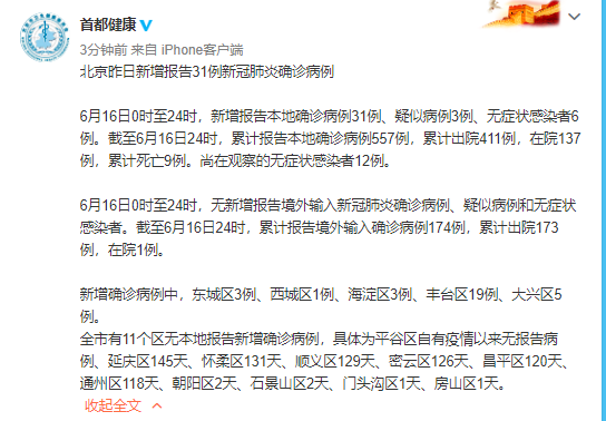 荔枝新闻讯 据北京卫健委通报,6月16日0时至24时,新增报告本地确诊病例31例、疑似病例3例、无症状感染者6例。截至6月16日24时,累计报告本地确诊病例557例,累计出院411例,在院137例,累计死亡9例。尚在观察的无症状感染者12例。