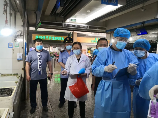 在市场监管部门配合下,全省13个设区市卫生健康部门工作人员迅速行动,随机抽取人流量较大的水产品和农贸市场,开展重点食品、重点环境和市场从业人员应急监测工作。