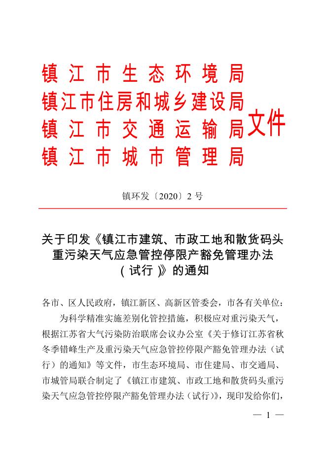 我苏网讯 日前,镇江市生态环境局、住建局、交通运输局和城管局等部门联合印发试行管理办法,对建筑、市政工地和散货码头,实行重污染天气应急管控停限产豁免管理。