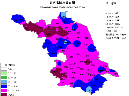 11日后半夜以来,我省大部分地区累计雨量超过100毫米,其中淮北和西南部地区超过250毫米。经统计,12日00时-17日07时累计雨量:我省有1414个乡镇(街道)超过50毫米(占全省94.3%),其中有977个乡镇(街道)超过100毫米(占全省65.1%),73个乡镇(街道)超过250毫米(占全省4.9%),最大南京市浦口区桥林乌江453.9毫米。