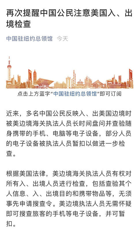 荔枝新闻讯 据“中国驻纽约总领馆”微信公号6月17日消息,近来,多名中国公民反映入、出美国边境时被美边境海关执法人员长时间盘问并查验随身携带的手机、电脑等电子设备,部分人员的电子设备被执法人员暂扣以做进一步检查。