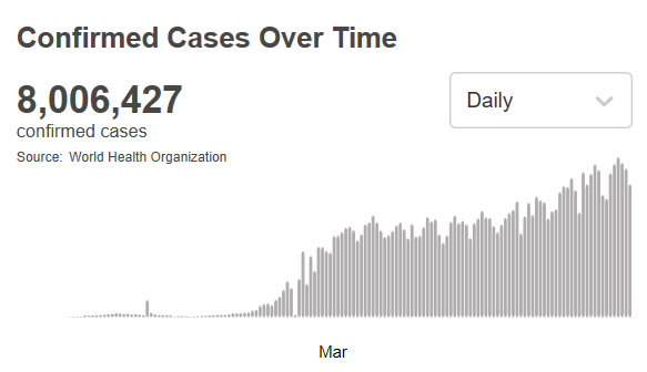 根据世卫组织最新实时统计数据,截至欧洲中部夏令时间6月17日8时30分(北京时间6月17日14时30分),全球新冠肺炎确诊病例达8006427例,死亡436899例。
