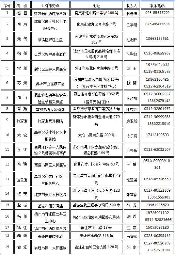 江苏省2020年省属事业单位统一公开招聘人员笔试前核酸检测服务点