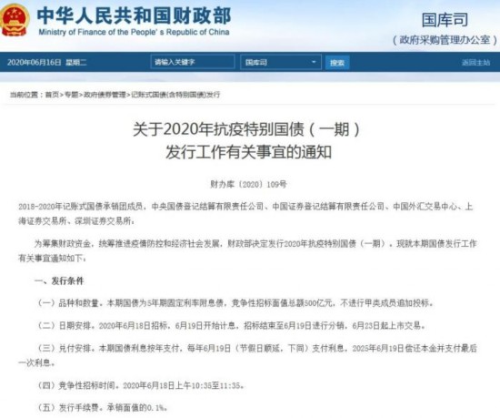抗疫特别国债将从6月中旬开始发行,7月底前发行完毕。
