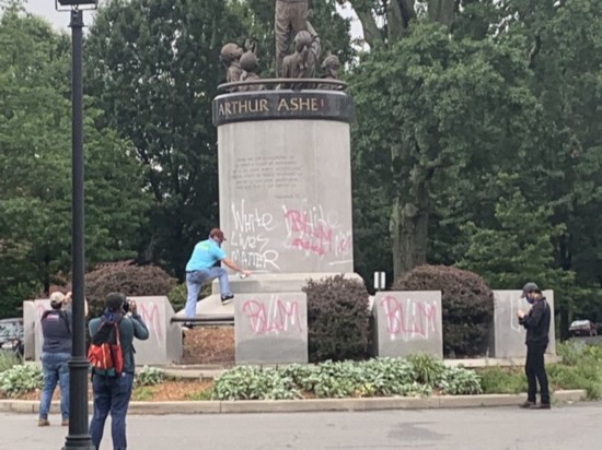 据美国福克斯新闻报道,这座遭到破坏的雕像人物是美国知名黑人网球运动员阿瑟·阿什(Arthur Ashe),地点位于弗吉尼亚州里士满。现场画面显示,纪念雕像的底部上被人用喷漆和雕刻的方式标上了“白人的命也是命”(White Lives Matter)字样。随后,又被其他抗议者喷上“黑人的命也是命”用以覆盖。