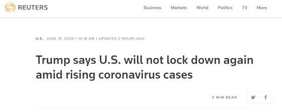 路透社称,在特朗普发表上述言论之前,白宫经济顾问拉里·库德洛和美国财政部长史蒂文·姆努钦均表示,美国不会再次关停经济。报道援引《纽约时报》消息称,副总统彭斯在与州长们的电话会议中也鼓励他们重申政府的说法,即病例增加是扩大病毒检测的结果。