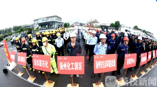 事件模拟扬州化学工业园区远东联一化工装置发生事故,初步预演有环境次生灾害可能,仪征市迅速启动应急预案,单位自行组织人员撤离,各级消防驰援,并成功处置了这起“突发环境事件”。