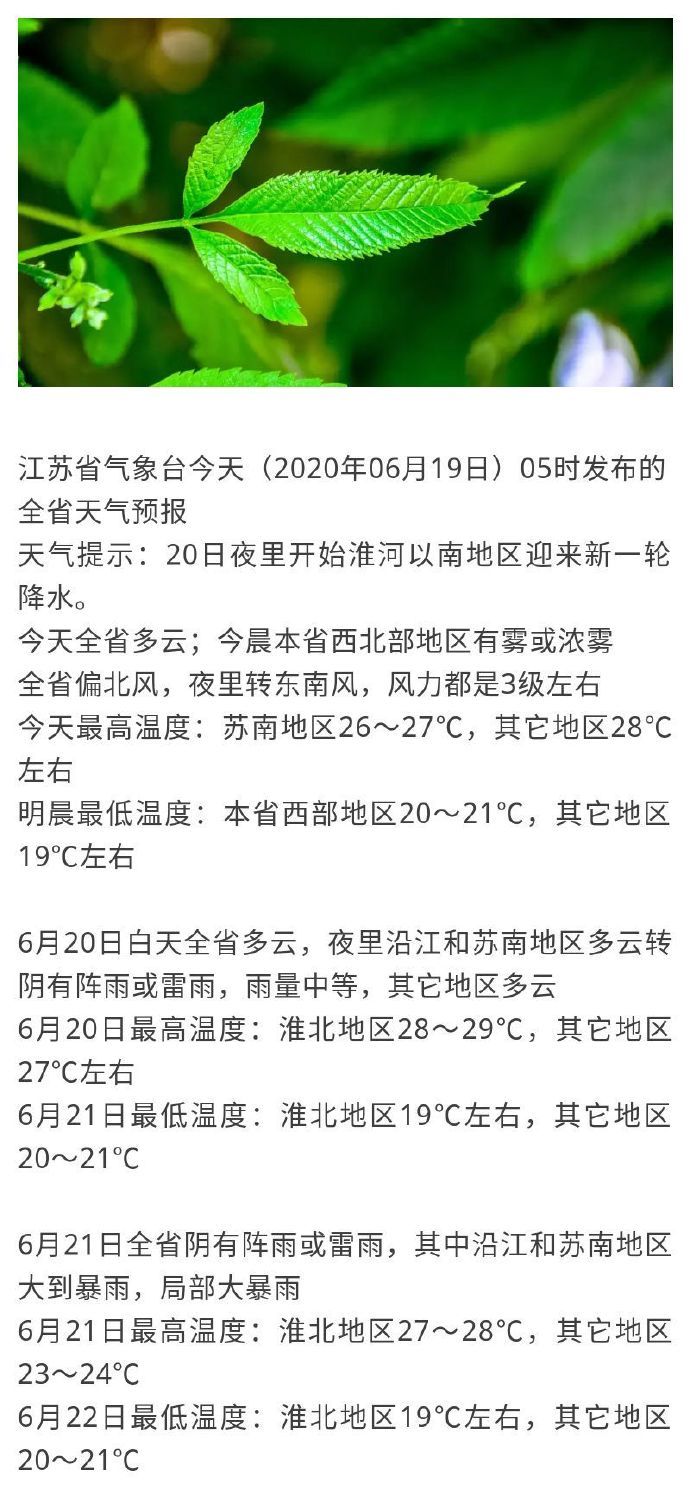 今天(6月18日)江苏全省多云;今晨本省西北部地区有雾或浓雾,全省偏北风,夜里转东南风,风力都是3级左右,今天最高温度:苏南地区26~27℃,其它地区28℃左右,明晨最低温度:本省西部地区20~21℃,其它地区19℃左右。